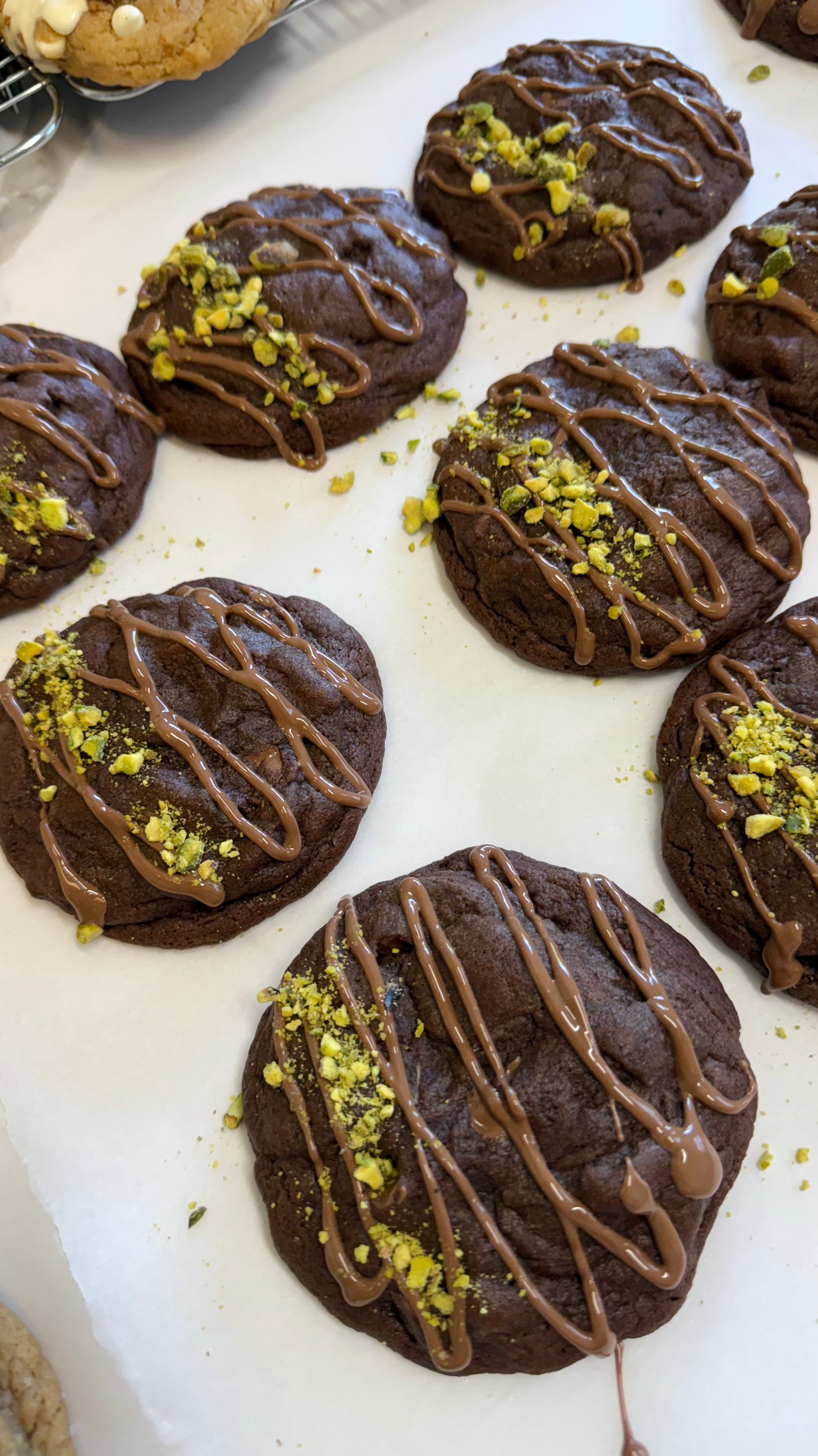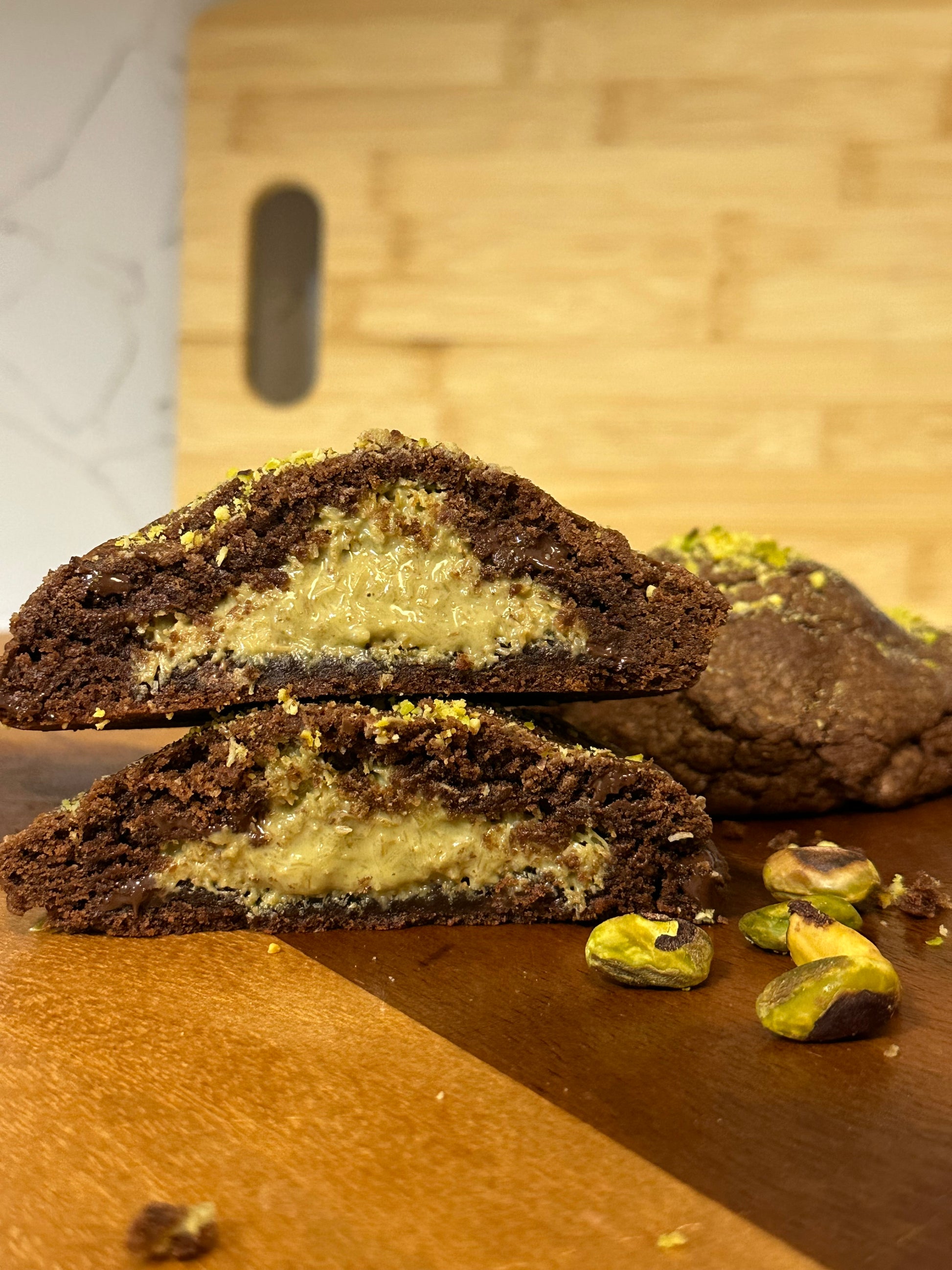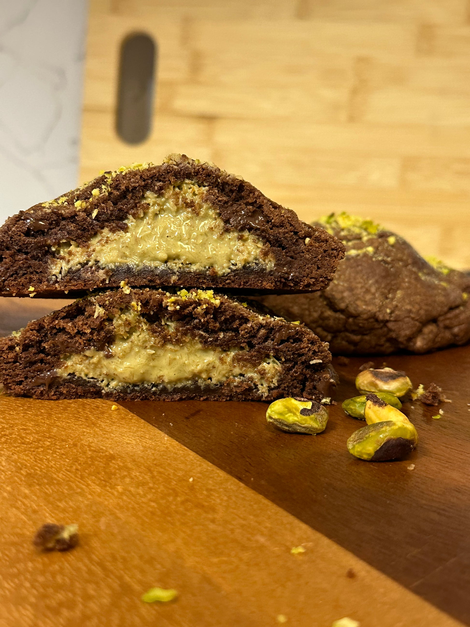 Midnight in Dubai cookie, a triple chocolate cookie stuffed with Dubai chocolate 🤍 a cookie flavor experience like never beforeÂ
